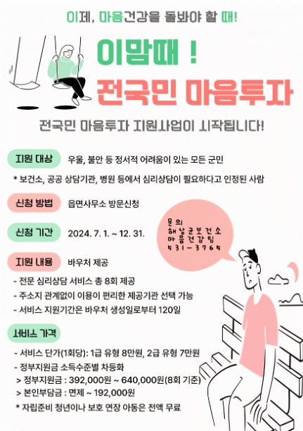 ¿ì¿ï, ºÒ¾È µî Á¤¼Àû ¾î·Á¿òÀ» °Þ´Â ±¹¹Îµé¿¡°Ô 120Àϰ£ 8ȸºÐÀÇ ½É¸®»ó´ãÀ» ¹ÞÀ» ¼ö ÀÖ´Â ¹Ù¿ìó Ä«µå¸¦ ¹ß±ÞÇϰí, ±¹°¡¡¤¹Î°£ ÀÚ°ÝÀ» °®Ãá »ó´ã±â°ü¿¡¼ ¹«·á·Î ¼ºñ½º¸¦ Á¦°øÇÑ´Ù.