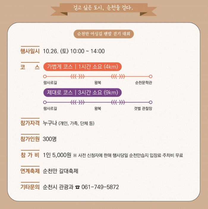 °È±â ÄÚ½º´Â ¿Õº¹ÄÚ½º·Î °È±â Ãʺ¸ÀÚ¸¦ À§ÇÑ 4km ÄÚ½º¿Í ¼øÃµ¸¸ÀÇ ÀÚ¿¬À» Á¦´ë·Î ´À³¥ ¼ö ÀÖ´Â 9km ÄÚ½º¸¦ ¿î¿µÇÑ´Ù. 4km ÄÚ½º´Â ¹«Áø±³¿¡¼ ½ºÄ«ÀÌÅ¥ºê ¼øÃµ¸¸¿ª±îÁö À̾îÁö´Â °¥´ë¿Â÷±æÀ» µû¶ó õÇýÀÇ ÀÚ¿¬°ú ¹®È¸¦ üÇèÇÒ ¼ö ÀÖ´Â ±¸°£ÀÌ´Ù. 9km ÄÚ½º´Â ¼øÃµ¸¸ ÇØ¾È°¡ ¶Ò¹æ±æÀ» µû¶ó °¹¹ú°ú °¥´ë¸¦ °¨»óÇÏ¸ç °ÉÀ» ¼ö ÀÖ´Â Èú¸µÄÚ½ºÀÌ´Ù. ¿Ïº¸ÀÚ¿¡°Ô´Â »Ì±â¸¦ ÅëÇØ ¼øÃµ½Ã ij¸¯ÅÍÀÎ ¡®·ç¹Ì¶×ÀÌ¡¯ °ü±¤±ÂÁî µî ¼ÒÁ¤ÀÇ ±â³äǰµµ Á¦°øÇÒ ¿¹Á¤ÀÌ´Ù.