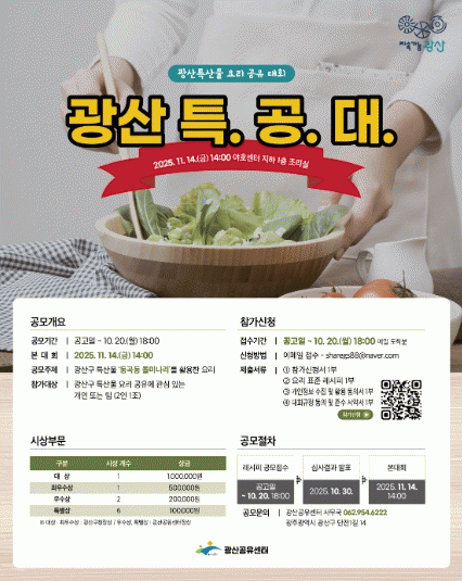Âü¿© ´ë»óÀº ±¤»ê±¸ Ư»ê¹° ¿ä¸® °øÀ¯¿¡ °ü½ÉÀÌ ÀÖ´Â °³ÀÎ ¶Ç´Â 2ÀÎ 1Á¶ ÆÀÀ̸ç, 10¿ù 20ÀÏ ¿ÀÈÄ 6½Ã±îÁö ±¤»ê°øÀ¯¼¾ÅÍ ´©¸®Áý °ø°í¹®À» Âü°íÇØ ÀüÀÚ¿ìÆíÀ¸·Î Á¢¼öÇÏ¸é µÈ´Ù.