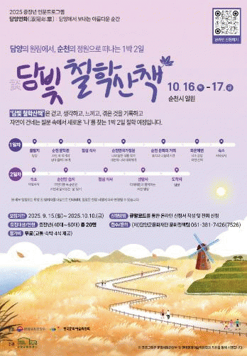 À̹ø ÇÁ·Î±×·¥Àº ¼øÃµÀÇ Á¤¿ø°ú »ýÅ °ø°£À» °ÉÀ¸¸ç ¸í»ó°ú ±Û¾²±â¸¦ ÅëÇØ ³»¸éÀÇ ¸ñ¼Ò¸®¿¡ ±Í ±â¿ïÀÌ°í »îÀ» µÇµ¹¾Æº¸´Â ¿©Á¤À¸·Î, 10¿ù 16ÀÏ ´ã¾ç¿¡¼ Ãâ¹ßÇØ ¼øÃµ Àϴ븦 ¿©ÇàÇÑ´Ù.