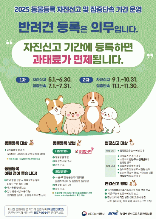 ¶Ç ÀÌ¹Ì µî·ÏÇß´õ¶óµµ µ¿¹°ÀÇ ¼ÒÀ¯ÀÚ³ª ¼ÒÀ¯ÀÚÀÇ ÁÖ¼Ò¡¤ÀüȹøÈ£, µ¿¹°ÀÇ »óÅÂ(À¯½Ç, µÇãÀ½, »ç¸Á) µîÀÌ º¯°æµÈ °æ¿ì ¹Ýµå½Ã º¯°æ ½Å°íÇØ¾ß ÇÑ´Ù.
