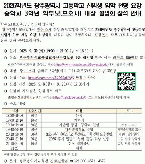 ¶Ç Çб³ÀåÀÌ Á÷Á¢ ÇлýÀ» ¼±¹ßÇÏ´Â ±¤ÁÖ¿¹¼ú°í, ±¤ÁÖÇü ¸¶À̽ºÅÍ°í ±¤ÁÖ°ø¾÷°í, ¼Û¿ø¿©ÀÚ»ó¾÷°í(¿À´Â 2026³âºÎÅÍ ¼Û¿ø¹Ì·¡ÀÎÀç°í), ±ÝÆÄ°ø¾÷°í µî ÀϺΠÀü±â °íµîÇб³ÀÇ °æ¿ì ÀüÇüÀÌ º¯°æµÉ ¿¹Á¤À¸·Î, ¹Ì¸® È®ÀÎÀÌ ÇÊ¿äÇÏ´Ù. ±¤ÁÖ¿¹¼ú°í´Â ±³°ú ¼ºÃëµµ Àý´ëÆò°¡ »êÃâ¹æ½ÄÀ¸·Î º¯°æµÇ°í ÁßÇб³ ³»½Å¼ºÀû À§ÁÖ Æ¯º°ÀüÇüÀ» ÆóÁöÇÑ´Ù. ¼Û¿ø¿©ÀÚ»ó¾÷°í´Â ¼Û¿ø¹Ì·¡ÀÎÀç°í·Î ¸íĪÀ» ¹Ù²Ù°í, ³²³à°øÇÐÀ¸·Î ÀüȯÇÑ´Ù.