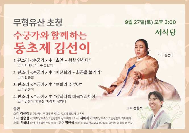 À̹ø °ø¿¬¿¡¼´Â ±è¼±ÀÌ º¸À¯ÀÚ°¡ °í¼ö Á¤ÇѼ®°ú ÇÔ²² '¼ö±Ã°¡'ÀÇ ´ëÇ¥ ´ë¸ñÀ» ¼±º¸À̰í, ÀÌ¾î ¹éÁ¦³²µµ¼Ò¸®°í¹ýÁøÈïȸÀÇ ÇѽÂö¡¤Â÷¿¹Áö ¸íâÀÌ ÁÖ¿ä ´ë¸ñÀ» ³ª´©¾î ºÒ·¯ ´Ùä·Î¿î ¹«´ë¸¦ ²Ù¹Î´Ù. ¸¶Áö¸·¿¡´Â Ã⿬ÁøÀÌ ¸ðµÎ ÇÔ²²ÇÏ´Â ÀÔüâ ¹«´ë°¡ À̾îÁ® °ü°´µé¿¡°Ô ÆÇ¼Ò¸®ÀÇ Áø¼ö¸¦ µé·ÁÁÙ ¿¹Á¤ÀÌ´Ù.