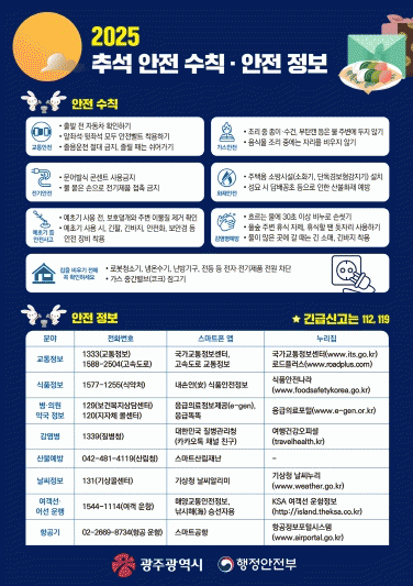 ±¤Áֽô Ãß¼® Àü±îÁö ºÐ¾ßº° ¾ÈÀüÁ¡°ËÀ» ¸¶Ä¡°í, ¿¬ÈÞ°¡ ³¡³ª´Â 10¿ù 9ÀϱîÁö ±¤Áֽà ´©¸®Áý, Àü±¤ÆÇ, »çȸ°ü°è¸Á¼ºñ½º(SNS) µîÀ» ÅëÇØ ½Ã¹Îµé¿¡°Ô ¾ÈÀü¼öÄ¢°ú »ýȰÁ¤º¸¸¦ ¾È³»ÇÑ´Ù.