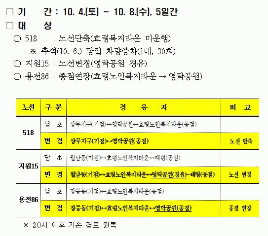 »ó¹«Áö±¸~Á¾ÇÕ¹ö½ºÅ͹̳Î~¿µ¶ô°ø¿øÀ» ¿îÇàÇÏ´Â 518¹ø ½Ã³»¹ö½º´Â Ãß¼® ´çÀÏ(6ÀÏ) 30ȸ ÁõÂ÷ ¿îÇàÇϰí, ¿ù³²µ¿~Å·ÉÀ» ¿îÇàÇÏ´Â Áö¿ø15¹øÀº ¿µ¶ô°ø¿øÀ» °æÀ¯ÇØ ¿îÇàÇÑ´Ù.