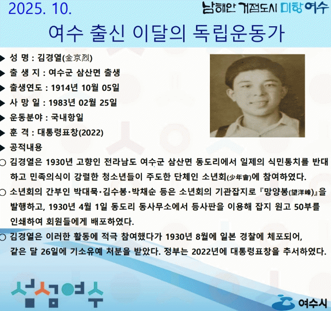 ±è°æ¿ ¼±»ýÀº 1930³â °íÇâÀÎ ¿©¼ö±º »ï»ê¸é µ¿µµ¸®¿¡¼ ÀÏÁ¦ÀÇ ½Ä¹ÎÅëÄ¡¸¦ ¹Ý´ëÇÏ°í ¹ÎÁ·ÀǽÄÀÌ °·ÄÇÑ Ã»¼Ò³âµéÀÌ ÁÖµµÇÑ ´ÜüÀÎ ¼Ò³âȸ(á´Ò´üå)¿¡ Âü¿©Çß´Ù.