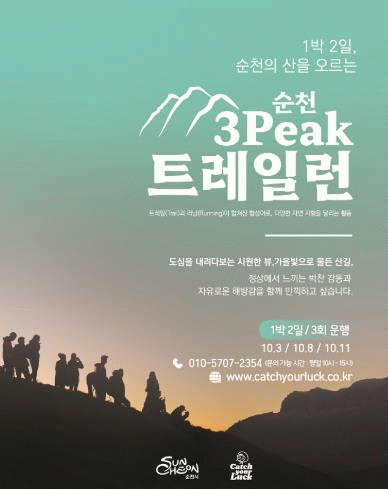 ÁÖ¿ä ÀÏÁ¤Àº ¡ã¼øÃµ¸¸½ÀÁö¿¡¼ ÈæµÎ·ç¹Ì ±º¹« °üÂû ¡ã¿ë»ê Àü¸Á´ë Àϸô °¨»ó ¡ãÀå»êµÏ±æ »õº® ŽÁ¶ µîÀ¸·Î ¸¶·ÃµÆÀ¸¸ç 10¿ù 25~26ÀÏ, 10¿ù 31~11¿ù 1ÀÏ, 11¿ù 1~2ÀÏ, 11¿ù 8~9ÀÏ·Î ÃÑ 4ȸ¿¡ °ÉÃÄ ¿î¿µµÈ´Ù.