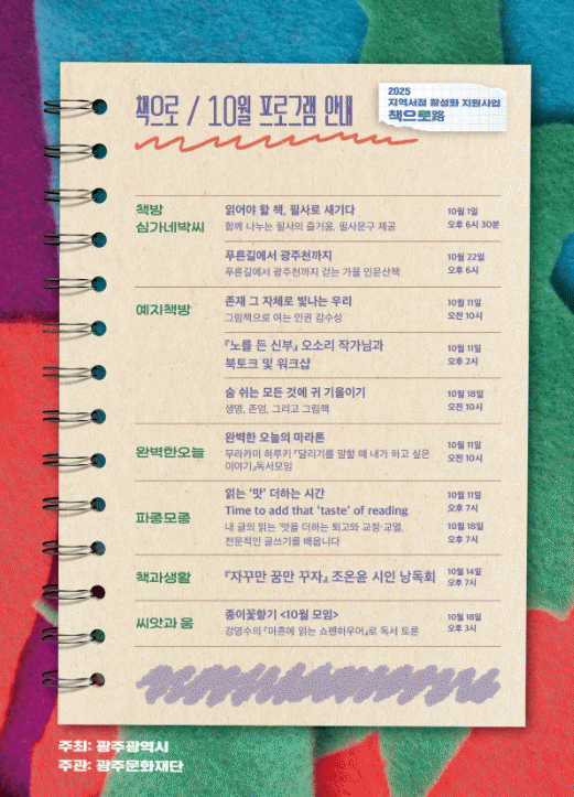 ¸ÕÀú ¡ã¡®Ã¥¹æ ½É°¡³×¹Ú¾¾¡¯¿¡¼´Â ¿À´Â 10¿ù 1ÀÏ ¿ÀÈÄ 6½Ã 30ºÐ, ¡®Àоî¾ß ÇÒ Ã¥, ÇÊ»ç·Î »õ±â´Ù¡¯¸¦ ÅëÇØ Àλý Ã¥ ¸í¹®ÀåÀ» ÇÊ»çÇÏ¸ç ³ª´©´Â ½Ã°£À» °®°í, 10¿ù 22ÀÏ ¿ÀÈÄ 6½Ã¿¡´Â ¡®Çª¸¥±æ¿¡¼ ±¤ÁÖõ±îÁö¡¯ °¡À» Àι®»êÃ¥À» ÁøÇàÇÑ´Ù.
