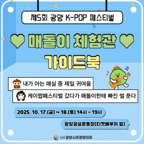 ¡®¸Åµ¹ÀÌ Ã¼Çè°ü¡¯Àº ±¤¾çÀÇ ´ëÇ¥ ij¸¯ÅÍ ¡®¸Åµ¹ÀÌ¡¯¸¦ ÁÖÁ¦·Î ÇÑ ¿À°¨Çü üÇè °ø°£À¸·Î, ¿À´Â 10¿ù 17~18ÀÏ ±¤¾ç°ø¼³¿îµ¿Àå¿¡¼ ¿¸®´Â Æä½ºÆ¼¹úÀÇ ÇöÀå ºÐÀ§±â¸¦ ÇÑÃþ °íÁ¶½Ãų Àü¸ÁÀÌ´Ù.