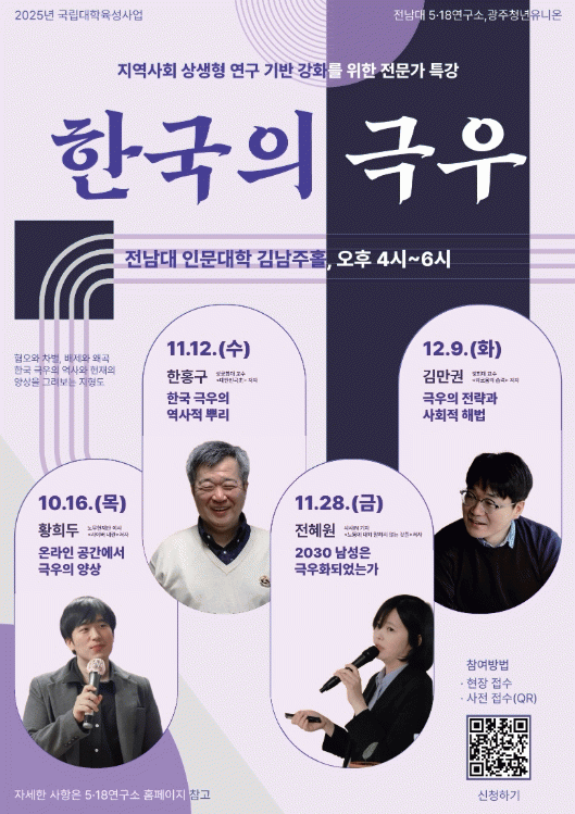 15ÀÏ Àü³²´ë¿¡ µû¸£¸é, Àü³²´ëÇб³ 5¡¤18¿¬±¸¼Ò´Â ÀÌ´ÞºÎÅÍ ¿À´Â 12¿ù±îÁö ÃÑ 4Â÷·Ê¿¡ °ÉÃÄ ¡®Çѱ¹ÀÇ ±Ø¿ì¡¯¸¦ ÁÖÁ¦·Î ÇÑ ¿¬¼Ó °¿¬À» ÁøÇàÇÑ´Ù.