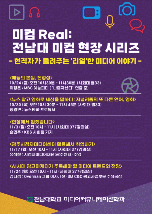 20ÀÏ Àü³²´ë¿¡ µû¸£¸é ¹Ìµð¾îÄ¿¹Â´ÏÄÉÀ̼ÇÇаú´Â 10¿ù 24ÀϺÎÅÍ 11¿ù 24ÀϱîÁö ¡®¹ÌÄÄ Real: Àü³²´ë ¹ÌÄÄ ÇöÀå ½Ã¸®Á¸¦ °³ÃÖÇϰí, ¹æ¼Û¡¤Àú³Î¸®Áò¡¤¿µÈ¡¤±¤°í¡¤¹Ìµð¾î °ø°ø±â°ü µî ´Ù¾çÇÑ ºÐ¾ßÀÇ ½Ç¹« Àü¹®°¡µéÀ» ÃÊÃ»ÇØ »ý»ýÇÑ ÇöÀå °æÇè°ú Ãë¾÷ Àü·«À» ÀüÇϴ Ưº° °¿¬ ¸±·¹À̸¦ ÁøÇàÇÑ´Ù.