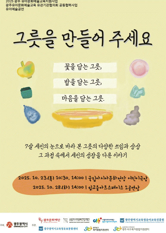 À̹ø »ç¾÷Àº ±¤ÁÖÀ¯¾Æ¹®È¿¹¼ú±³À° À¯°ü±â°üÇùÀÇȸ °øµ¿Çù·Â»ç¾÷À¸·Î ÃßÁøµÇ¸ç, ÇùÀÇȸ¿¡´Â ¡ã±¤ÁÖ¹®ÈÀç´Ü ¡ã±¹¸³¾Æ½Ã¾Æ¹®ÈÀü´çÀç´Ü ¡ã±¤ÁÖ½ÃûÀڹ̵ð¾î¼¾ÅÍ ¡ã±¤ÁÖÀ¯¾Æ±³À°ÁøÈï¿ø ¡ãÀ¯º¸ÅëÇÕ¼¾ÅÍ ¡ãµ¿±¸¡¤¼±¸À°¾ÆÁ¾ÇÕÁö¿ø¼¾ÅÍ µî ÃÑ 7°³ ±â°üÀÌ Âü¿© ÁßÀÌ´Ù.