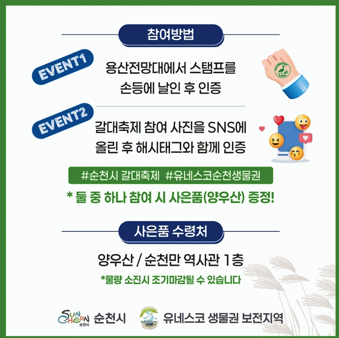 µÎ ¹øÂ°´Â ¼øÃµ¸¸°¥´ëÃàÁ¦ ÇöÀå¿¡¼ ÃÔ¿µÇÑ »çÁøÀ» #¼øÃµ¸¸°¥´ëÃàÁ¦, #À¯³×½ºÄÚ¼øÃµ»ý¹°±Ç µîÀÇ ÇØ½ÃÅÂ±×¿Í ÇÔ²² °³ÀÎ SNS¿¡ °Ô½Ã ÈÄ ¼øÃµ¸¸ ¿ª»ç°ü¿¡¼ ÀÎÁõÇÏ¸é µÈ´Ù.