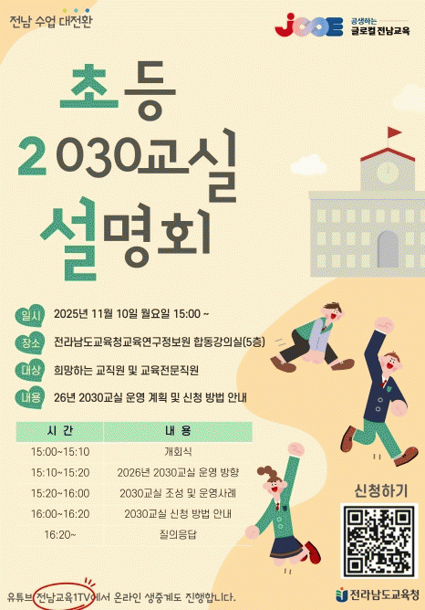 ÀÌ¿Í °ü·ÃÇØ Àü³²±³À°Ã»Àº ¿À´Â 10ÀÏ ¿ÀÈÄ 3½Ã Àü¶ó³²µµ±³À°Ã»±³À°¿¬±¸Á¤º¸¿ø¿¡¼ ¡®Ãʵî 2030±³½Ç ¼³¸íȸ¡¯¸¦ ¿¾î 2026Çг⵵ 2030±³½Ç ¿î¿µ °èȹ°ú ½Åû ¹æ¹ýÀ» ¾È³»ÇÑ´Ù.