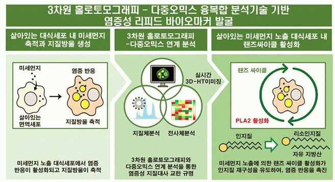 4ÀÏ Àü³²´ë¿¡ µû¸£¸é À̹ø ¿¬±¸´Â 3Â÷¿ø Ȧ·ÎÅä¸ð±×·¡ÇÇ(3D-holotomography)¿Í ´ÙÁß¿À¹Í½º(multi-omics) ºÐ¼® ±â¼úÀ» ÅëÇÕÇØ, »ì¾Æ ÀÖ´Â ´ë½Ä¼¼Æ÷(macrophage) ³»ºÎ¿¡¼ ¹Ì¼¼¸ÕÁö ³ëÃâ·Î ÀÎÇÑ ´ë»ç º¯È¸¦ ½Ç½Ã°£À¸·Î °üÂûÇÑ ÃÖÃÊ »ç·Ê·Î Æò°¡µÈ´Ù.