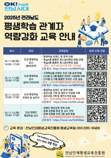 À̹ø ±³À°Àº Æò»ýÇнÀ °»ç, Æò»ýÇнÀ °ü°èÀÚ, Àå¾ÖÀÎ ´ë»ó Æò»ýÇнÀ °»ç¿Í °ü°èÀÚ¸¦ ´ë»óÀ¸·Î 8ÀϺÎÅÍ 13ÀϱîÁö ÃÑ 4ȸ¿¡ °ÉÃÄ, Àü³²ÀÎÀçÆò»ý±³À°ÁøÈï¿ø, ¼øÃµ »ï»êµµ¼°ü, ³ªÁÖ °øÀÍȰµ¿Áö¿ø¼¾ÅÍ¿¡¼ ÁøÇàµÈ´Ù.