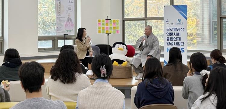 ¿¬¼º ½º´ÔÀº ÇöÀå Áß½ÉÀÇ °¿¬¿¡¼ ¡®ºÒ±³¿Í ±Û·Î¹ú °ø»ý¡¯À» ÁÖÁ¦·Î, Á¾±³ÀÇ °¡Ä¡¿Í öÇÐÀ» ÅëÇØ ±Û·Î¹ú »çȸ¿¡¼ÀÇ Çù·Â°ú °ø»ýÀ» ¼³¸íÇß´Ù. ½º´ÔÀº Çлýµé¿¡°Ô ±³¸® ¼Ò°³°¡ ¾Æ´Ñ »çȸ¡¤À±¸®Àû À̽´¸¦ Á¾±³Àû °üÁ¡¿¡¼ ¼ºÂûÇϰí À̸¦ ½ÇõÀ¸·Î ÀÕ´Â ±¸Ã¼Àû ¹æ¹ýÀ» Á¦½ÃÇß´Ù.