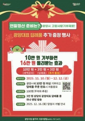 ±¤¾ç½Ã¿¡ 10¸¸ ¿ø ÀÌ»ó ±âºÎÇÏ°í ´ä·Êǰ ½ÅûÀ» ¿Ï·áÇÑ ±âºÎÀÚ Áß 100¸íÀ» Ãß÷ ÇÁ·Î±×·¥À» ÅëÇÑ ¹«ÀÛÀ§ ¹æ½ÄÀ¸·Î ¼±Á¤Çϸç, ´ç÷ ½Ã ±âº» ¼¼¾×°øÁ¦ ¹× ´ä·Êǰ ÇýÅà ¿Ü 3¸¸ ¿ø »ó´çÀÇ ±¤¾ç ´ëÇ¥ ´ä·ÊǰÀÌ Ãß°¡·Î Á¦°øµÈ´Ù.