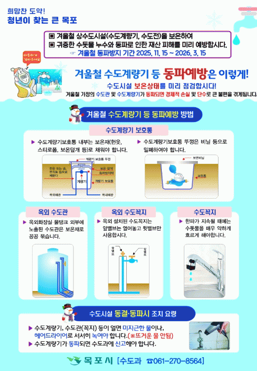 ¼öµµ°è·®±â³ª ¿ÜºÎ¿¡ ³ëÃâµÈ ¼öµµ°üÀº Çå¿Ê, ½ºÆ¼·ÎÆû, Çë°Ò µîÀ¸·Î °¨½Î Âù¹Ù¶÷ÀÌ µé¾î°¡Áö ¾Êµµ·Ï º¸¿ÂÇØ¾ß Çϸç, °ÃßÀ§°¡ Áö¼ÓµÉ °æ¿ì¿¡´Â ¼öµµ²ÀÁö¸¦ ¾àÇÏ°Ô Æ²¾î ¹°ÀÌ Á¶±Ý¾¿ È帣µµ·Ï ÇØ µ¿ÆÄ¸¦ ¿¹¹æÇÒ ¼ö ÀÖ´Ù.