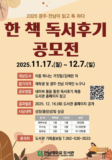 À̹ø °ø¸ðÀüÀº ¡®±¤ÁÖ¡¤Àü³²ÀÌ Àаí Åå ÇÏ´Ù¡¯»ç¾÷ÀÇ ÀÏȯÀ¸·Î, ¿ÃÇØÀÇ ÇÑ Ã¥À¸·Î ¼±Á¤µÈ ±è¾Ö¶õ ÀÛ°¡ÀÇ ¡ºÀÌÁß Çϳª´Â °ÅÁþ¸»¡»À» ÀÐ°í µ¶¼ÀÇ Àǹ̸¦ ³ª´©°í ¼·Î ´Ù¸¥ »ý°¢À» °øÀ¯Çϱâ À§ÇÑ ÃëÁö·Î ¸¶·ÃµÆ´Ù.