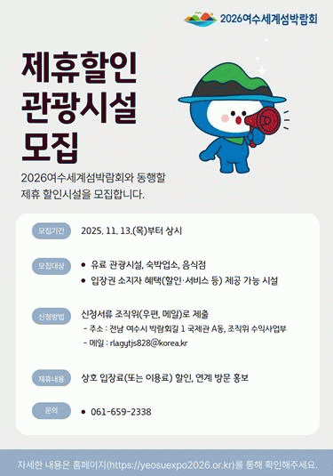 ÇÑÆí, 2026¿©¼ö¼¼°è¼¶¹Ú¶÷ȸ´Â ¡®¼¶, ¹Ù´Ù¿Í ¹Ì·¡¸¦ ÀÕ´Ù¡¯¸¦ ÁÖÁ¦·Î Àü¶ó³²µµ¿Í ¿©¼ö½Ã°¡ °øµ¿ ÁÖÃÖÇϸç Á¶Á÷À§ ÁÖ°üÇÏ´Â ±¹Á¦ Çà»çÀÌ´Ù.