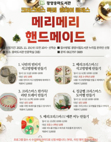 ¼¼ºÎ °Á´ ¡ãÃʵî 1~3Çг⠴ë»ó ¡®¸Þ¸®Å©¸®½º¸¶½º! ¿¹»Û ºñ´© ¸¸µé±â¡¯ ¡ãÃʵî 3~5Çг⠴ë»ó ¡®¸Þ¸®Å©¸®½º¸¶½º! ¼®°í ¹æÇâÁ¦ ¸¸µé±â¡¯ ¡ã¼ºÀÎ ´ë»ó ¡®³ª¸¸ÀÇ ºóƼÁö ¼®°í ¹æÇâÁ¦ ¸¸µé±â¡¯ ¡ã¡®Å©¸®½º¸¶½º ÇѰ¡µæ! ¶óź Æ®·¹ÀÌ ¸¸µé±â¡¯ ¡ã¡®Â¡±Ûº§ Å©¸®½º¸¶½º µµ¾îº§ ¸¸µé±â¡¯ ÃÑ 5°³´Ù.