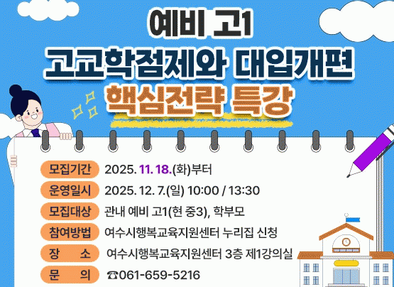 À̹ø Ư°Àº ¿À´Â 12¿ù 7ÀÏ ¿ÀÀü 10½Ã, ¿ÀÈÄ 1½Ã 30ºÐ µÎ Â÷·Ê¿¡ °ÉÃÄ ¿©¼ö½ÃÇູ±³À°Áö¿ø¼¾ÅÍ Á¦1°Àǽǿ¡¼ ÁøÇàµÇ¸ç ÃÑ 120¸íÀ» ¸ðÁýÇÑ´Ù.
