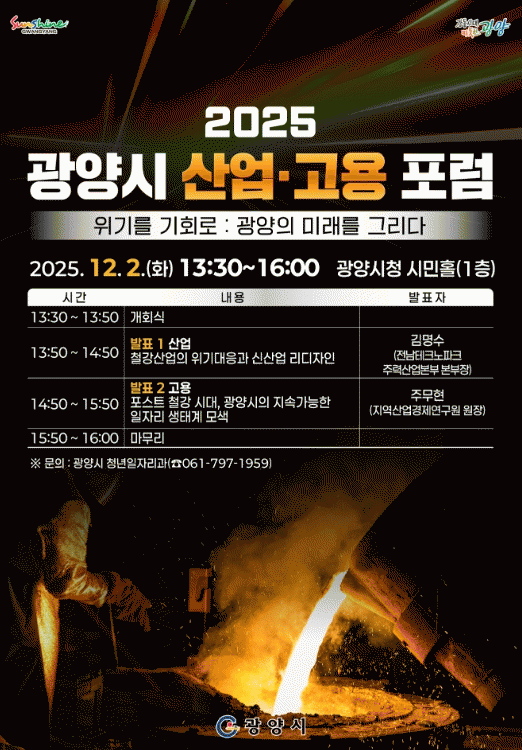 Á¶µ¿¼ö ±¤¾ç½Ã û³âÀÏÀÚ¸®°úÀåÀº ¡°À̹ø »ê¾÷¡¤°í¿ë Æ÷·³Àº ±¤¾çÀÌ Á÷¸éÇÑ Áß´ëÇÑ º¯È ¼Ó¿¡¼ À§±â¸¦ ±âȸ·Î ÀüȯÇϱâ À§ÇÑ ½ÇÁúÀûÀÎ ³íÀǸ¦ ÁøÇàÇÏ´Â ÀÚ¸®¡±¶ó¸ç ¡°°ü½É ÀÖ´Â ½Ã¹Î°ú ±â¾÷¡¤±â°ü °ü°èÀÚ ¿©·¯ºÐÀÇ ¸¹Àº Âü¿©¸¦ ¹Ù¶õ´Ù¡±°í ¸»Çß´Ù.