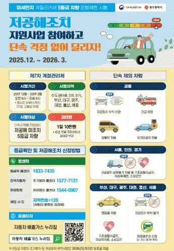 ¡®¹Ì¼¼¸ÕÁö °èÀý°ü¸®Á¦¡¯´Â °í³óµµ ¹Ì¼¼¸ÕÁö°¡ ÀæÀº 12¿ùºÎÅÍ À̵ëÇØ 3¿ù±îÁö 4°³¿ù°£ Ãʹ̼¼¸ÕÁö ¹ß»ý ¿øÀÎÀÌ µÇ´Â 5µî±Þ Â÷·®ÀÇ ¿îÇàÀ» ÁÙ¿© ½Ã¹Î °Ç°À» º¸È£Çϱâ À§ÇÑ Á¦µµ´Ù.