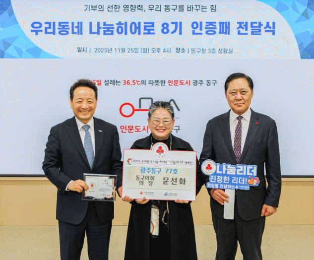 ¹® ÀÇÀåÀº 25ÀÏ ±¤ÁÖ µ¿±¸Ã»¿¡¼ ÁøÇàµÈ ³ª´®È÷¾î·Î ±âºÎ±ÝÀü´Þ½Ä¿¡¼ ÀÌ¿ôµ½±â ¼º±Ý 100¸¸¿øÀ» ±âºÎÇÏ°í ³ª´®È÷¾î·Î ÀÎÁõÆÐ¸¦ Àü´Þ¹Þ¾Ò´Ù. ÀÌ´Â Æò¼Ò Áö¿ª »çȸÀÇ ¾î·Á¿î ÀÌ¿ôµé¿¡°Ô ±íÀº °ü½ÉÀ» °¡Á®¿Â ¹® ÀÇÀåÀÇ ³ª´® öÇÐÀ» ½ÇõÇÑ °ÍÀÌ´Ù.