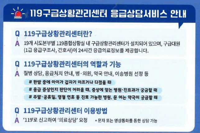 ÀÌ¿ë¹æ¹ýÀº °£´ÜÇÏ°Ô 119¿¡ ½Å°í ÈÄ ¡®ÀÇ·á»ó´ã ¿äû¡¯¶Ç´Â ¡®º´¿ø¾È³» ¿äû¡¯µîÀÇ ±¸±Þ °ü·Ã ¾÷¹«¸¦ ¿äûÇϸé Áï½Ã 119±¸±Þ»óȲ°ü¸®¼¾ÅÍ·Î ¿¬°áµÈ´Ù.