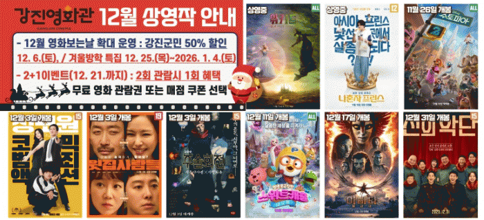 À̹ø °Ü¿ï¹æÇРƯÁý ¡®¿µÈ º¸´Â ³¯¡¯Àº Å©¸®½º¸¶½º, ¼Û³â ÁÖ°£, ½ÅÁ¤ ¿¬ÈÞ°¡ À̾îÁö´Â ±â°£ µ¿¾È 11ÀÏ ¿¬¼ÓÀ¸·Î ÁøÇàµÇ¸ç, °Áø±º¹ÎÀ̶ó¸é ´©±¸³ª ÃֽŠ¿µÈ¸¦ 50% ÇÒÀÎµÈ °¡°ÝÀ¸·Î °ü¶÷ÇÒ ¼ö ÀÖ´Ù.