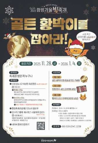 ÇÔÆòÃàÁ¦°ü±¤Àç´ÜÀº °Ü¿ïºûÃàÁ¦¸¦ ã´Â °ü±¤°´µé¿¡°Ô »ö´Ù¸¥ Àç¹Ì¸¦ Á¦°øÇϱâ À§ÇØ »çȸ°ü°è¸Á¼ºñ½º(SNS) Âü¿©Çü À̺¥Æ® ¡®°ñµç Ȳ¹ÚÀ̸¦ Àâ¾Æ¶ó!¡¯¸¦ ³»³â 1¿ù 4ÀÏ 24½Ã±îÁö ÁøÇàÇÑ´Ù°í 27ÀÏ ¹àÇû´Ù.