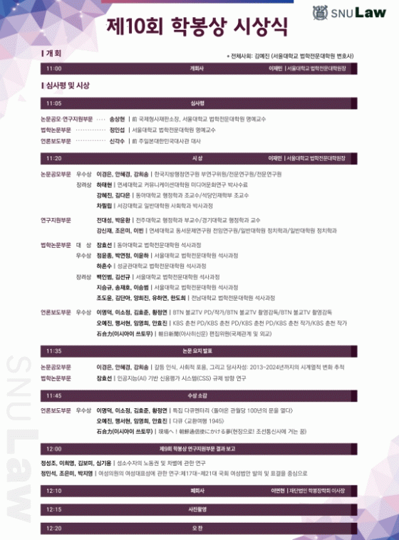 Á¦10ȸ ÇкÀ»ó ½Ã»ó½ÄÀº Áö³ 12¿ù 3ÀÏ ¿ÀÀü 11½Ã, ¼¿ï´ëÇб³ È£¾Ï±³¼öȸ°ü ¸ñ·ÃȦ¿¡¼ °³ÃֵƴÙ. À̹ø ¼ö»óÀÛÀº ¼¿ï´ëÇб³ ¹ýÇÐÀü¹®´ëÇпø ÇкÀ»ó °ø½Ä ȨÆäÀÌÁö¸¦ ÅëÇØ È®ÀÎÇÒ ¼ö ÀÖ´Ù.