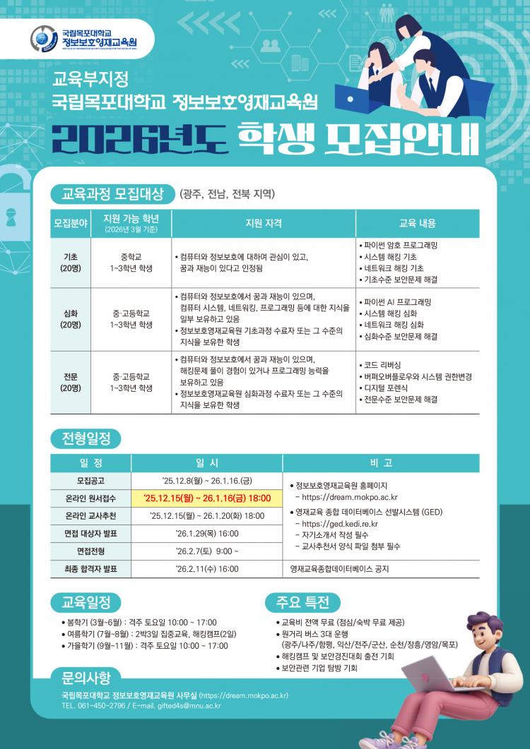 ±³À°ºñ´Â Àü¾× ¹«·áÀ̸ç, ±¤ÁÖ¡¤³ªÁÖ, ÀͻꡤÀüÁÖ¡¤±º»ê, ¼øÃµ¡¤ÀåÈ¸ñÆ÷ ¹æ¸éÀ¸·Î ¼ÅƲ¹ö½ºµµ ¿îÇàµÈ´Ù. »çȸÅëÇÕ´ë»óÀÚ´Â ÀüÇü ±¸ºÐ ¾øÀÌ ¹Ýº° Á¤¿øÀÇ 10% À̳»¿¡¼ ¿ì¼± ¼±¹ßµÈ´Ù.±³À°»ýµéÀº ÄÄÇ»ÅÍ ½Ã½ºÅÛ º¸¾È, ³×Æ®¿öÅ© º¸¾È, ¾ÏÈ£ÇÐ, ÇØÅ·»ç°íºÐ¼®, °³ÀÎÁ¤º¸º¸È£ µîÀÇ ¼ö¾÷¿¡ Âü¿©ÇÑ´Ù.