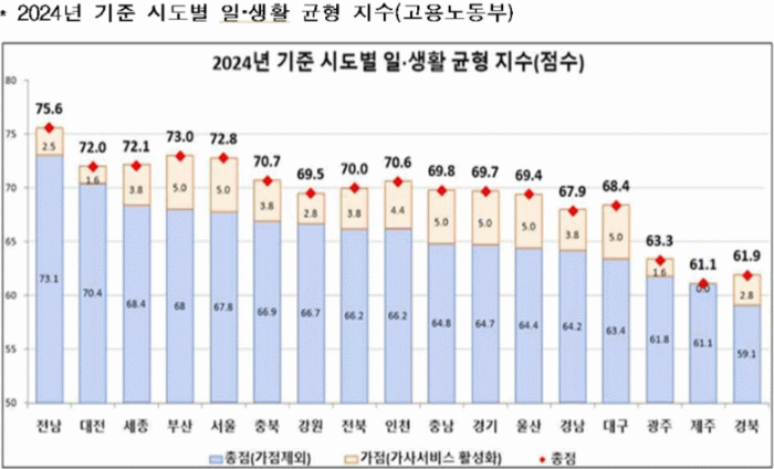 2024³â ÀÏ¡¤»ýȰ ±ÕÇüÁö¼ö Æò°¡ °á°ú, Àü±¹ 17°³ ½Ã¡¤µµ Æò±ÕÀº 65.7Á¡À̸ç Àü³²Àº À̺¸´Ù 7.4Á¡ ³ô¾ÒÀº Á¡¼ö¸¦ ±â·ÏÇß´Ù.