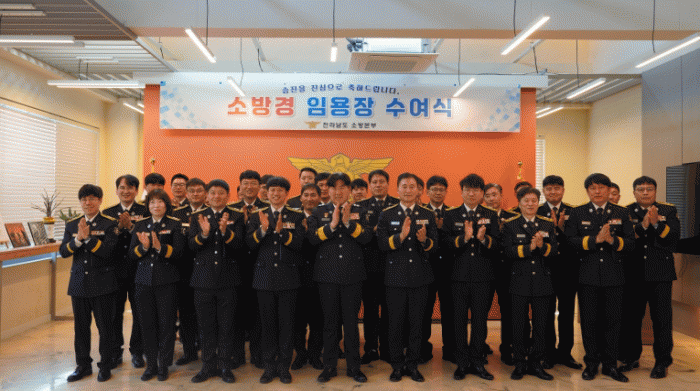 ÁÖ¿µ±¹ Àü³²¼Ò¹æº»ºÎÀåÀº ½ÂÁøÀڵ鿡°Ô Á÷Á¢ °è±ÞÀåÀ» ºÎÂøÇϰí ÀÓ¿ëÀåÀ» ¼ö¿©Çϸç ÃàÇÏ¿Í ÇÔ²² µû¶æÇÑ °Ý·ÁÀÇ ¸Þ½ÃÁö¸¦ ÀüÇß´Ù.