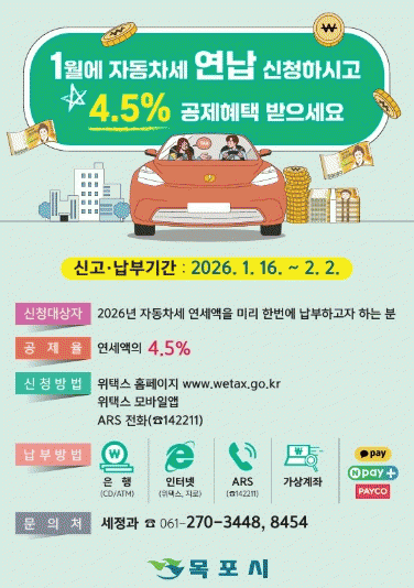 ¿¬³³ ½Åû ´ë»óÀº 2026³â 1¿ù ÇöÀç ¸ñÆ÷½Ã¿¡ µî·ÏµÈ Â÷·® ¼ÒÀ¯ÀÚ´Ù. Áö³ÇØ ÀÚµ¿Â÷¼¼¸¦ ¿¬³³ÇÑ ³³¼¼ÀÚ´Â º°µµÀÇ ½Åû ¾øÀÌ ¼¼¾× °øÁ¦°¡ Àû¿ëµÈ ¿¬³³ °íÁö¼°¡ ÀÚµ¿À¸·Î ¹ß¼ÛµÈ´Ù. ½Å±Ô ½ÅûÀÚ´Â ¸ñÆ÷½Ãû ¼¼Á¤°ú¸¦ ¹æ¹®Çϰųª ÀüÈ·Î ½ÅûÇÒ ¼ö ÀÖÀ¸¸ç, À§Åýº¿Í ¸ð¹ÙÀÏÀ» ÅëÇØ¼µµ ½Åû ¹× ³³ºÎ°¡ °¡´ÉÇÏ´Ù. ¿¬³³ ±â°£ ³» ³³ºÎÇÏÁö ¾ÊÀ» °æ¿ì¿¡´Â Á¤±â ³³ºÎ ±â°£ÀÎ 6¿ù°ú 12¿ù¿¡ º»·¡ÀÇ ÀÚµ¿Â÷¼¼¸¦ ³³ºÎÇØ¾ß ÇÑ´Ù.