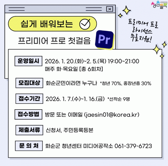 À̹ø ±³À°Àº ¿µ»ó ÆíÁý ÀÔ¹®ÀÚ¸¦ ´ë»óÀ¸·Î ÁøÇàµÇ¸ç, ÇÁ¸®¹Ì¾î ÇÁ·ÎÀÇ ±âº» ±â´ÉºÎÅÍ ÄÆ ÆíÁý, Æ®·£Áö¼Ç, À½Çâ ÀÛ¾÷, ÀÌÆåÆ® È¿°ú±îÁö ¿µ»ó Á¦ÀÛ Àü °úÁ¤À» ½Ç½À Áß½ÉÀ¸·Î ´Ù·ê ¿¹Á¤ÀÌ´Ù.