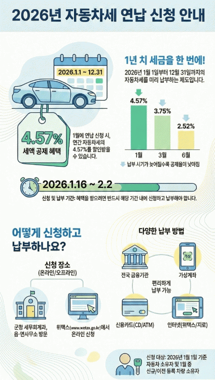ÀÚµ¿Â÷¼¼´Â ¸Å³â 6¿ù°ú 12¿ù µÎ Â÷·Ê ºÎ°úµÇ´Âµ¥, 1¿ù¿¡ ¿¬³³ÇÏ¸é ¿¬¼¼¾×ÀÇ 4.57%¸¦ °øÁ¦¹ÞÀ» ¼ö ÀÖ´Ù.