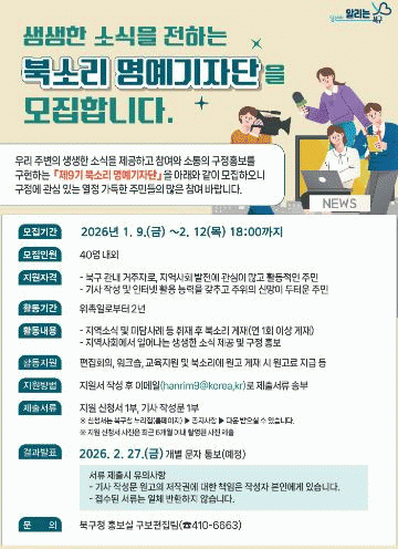 ¹®ÀÎ ºÏ±¸Ã»ÀåÀº ¡°ºÏ¼Ò¸® ¸í¿¹±âÀÚ´ÜÀº ÁÖ¹ÎÀÌ Á÷Á¢ Áö¿ªÀÇ º¯È¿Í ÀÏ»óÀ» ÀüÇÏ´Â ¸Þ½ÅÀúÀÎ ¸¸Å À̹ø ¸ðÁý¿¡ ¸¹Àº °ü½É°ú Âü¿©¸¦ ¹Ù¶õ´Ù¡±¸ç ¡°¾ÕÀ¸·Îµµ ºÏ¼Ò¸®°¡ Áֹΰú ÇàÁ¤ÀÇ ¼ÒÅë ⱸ ¿ªÇÒÀ» ÇÒ ¼ö ÀÖµµ·Ï ´Ù¾çÇÑ Áö¿øÀ» ¾Æ³¢Áö ¾Ê°Ú´Ù¡±°í ¸»Çß´Ù.