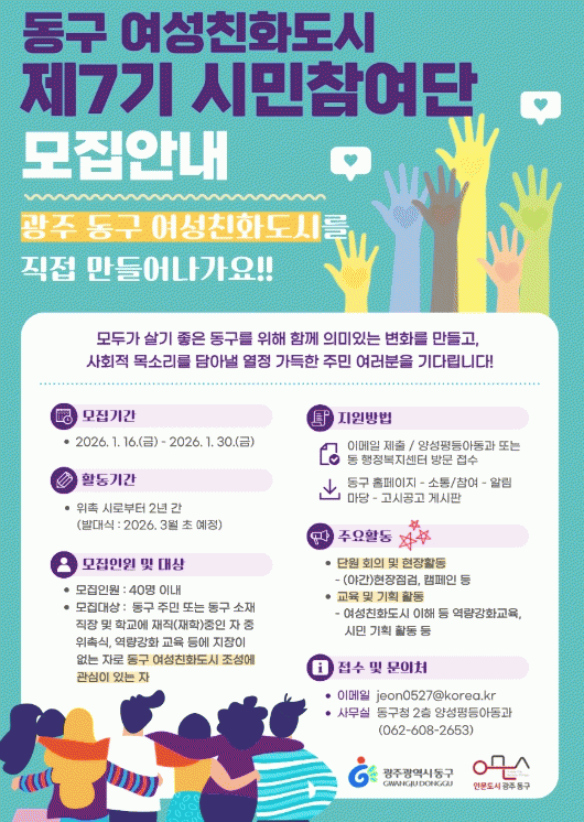 Á¦7±â ¿©¼ºÄ£Èµµ½Ã ½Ã¹ÎÂü¿©´Ü ½ÅûÀº µ¿±¸Ã» ¾ç¼ºÆòµî¾Æµ¿°ú ¶Ç´Â µ¿ ÇàÁ¤º¹Áö¼¾Å͸¦ ÅëÇØ À̸ÞÀÏ¡¤¹æ¹® Á¢¼ö·Î ÇÒ ¼ö ÀÖÀ¸¸ç, ±âŸ ÀÚ¼¼ÇÑ »çÇ×Àº µ¿±¸Ã» ´©¸®Áý °ø°í¹®¿¡¼ È®ÀÎÇÒ ¼ö ÀÖ´Ù.