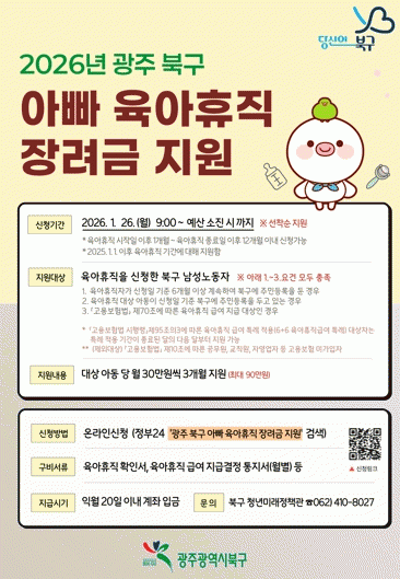 ¾Æºü À°¾ÆÈÞÁ÷ Àå·Á±ÝÀ» Áö¿ø¹Þ°íÀÚ ÇÏ´Â ÁÖ¹ÎÀº ºÏ±¸Ã» ´©¸®Áý¿¡ °Ô½ÃµÈ °ø°í¹®À» Âü°íÇØ ½ÅûÇÏ¸é µÇ°í ±âŸ ÀÚ¼¼ÇÑ »çÇ×Àº ºÏ±¸Ã» û³â¹Ì·¡Á¤Ã¥°üÀ¸·Î ¹®ÀÇÇÏ¸é µÈ´Ù.