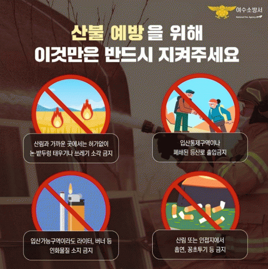 ¿©¼ö¼Ò¹æ¼´Â »êºÒ ¿¹¹æÀ» À§ÇØ ½Ã¹Îµé¿¡°Ô ´ÙÀ½°ú °°Àº »çÇ×À» ¹Ýµå½Ã ÁöÄÑÁÙ °ÍÀ» ´çºÎÇß´Ù. ÁÖ¿ä ³»¿ëÀº ¡ã»ê¸²°ú ÀÎÁ¢ÇÑ Áö¿ª¿¡¼ Çã°¡ ¾ø´Â ³í¡¤¹çµÎ·· Å¿ì±â ¹× ¾²·¹±â ¼Ò°¢ ±ÝÁö ¡ãÀÔ»êÅëÁ¦±¸¿ª ¹× Æó¼âµÈ µî»ê·Î ÃâÀÔ ±ÝÁö ¡ãÀÔ»ê °¡´É ±¸¿ªÀÌ¶óµµ ¶óÀÌÅÍ, ¹ö³Ê µî ÀÎȹ°Áú ¼ÒÁö ±ÝÁö ¡ã»ê¸² ¶Ç´Â ÀÎÁ¢ Áö¿ª¿¡¼ Èí¿¬ ¹× ´ã¹è²ÇÃÊ Åõ±â ±ÝÁö µîÀÌ´Ù.