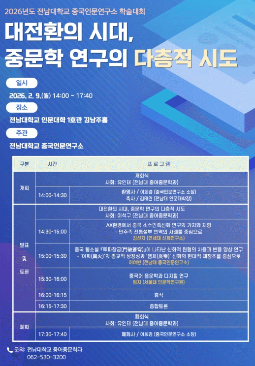Àü³²´ëÇб³ Áß±¹Àι®¿¬±¸¼Ò´Â ¿À´Â 2¿ù 9ÀÏ, Àü³²´ëÇб³ ±è³²ÁÖȦ¿¡¼ ¡®´ëÀüȯÀÇ ½Ã´ë, Áß¹®ÇÐ ¿¬±¸ÀÇ ´ÙÃþÀû ½Ãµµ¡¯¸¦ ÁÖÁ¦·Î 2026³âµµ Çмú´ëȸ¸¦ °³ÃÖÇÑ´Ù.