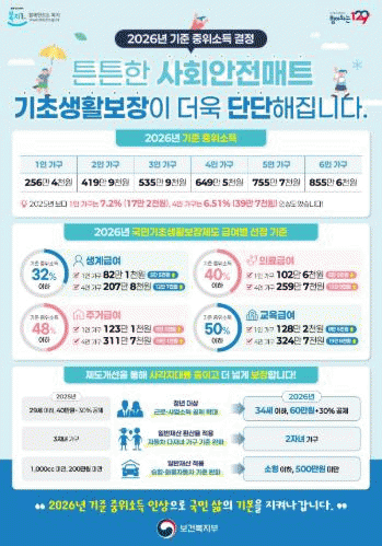 2026³â ±âÁØÁßÀ§¼Òµæ(±¹¹Î °¡±¸¼ÒµæÀÇ Áß°£°ªÀ¸·Î º¹Áö»ç¾÷À» ¼±Á¤ÇÏ´Â ±âÁØ)Àº 4ÀÎ °¡±¸ ±âÁØ 649¸¸ 4õ738¿øÀ¸·Î Áö³Çغ¸´Ù 6.51% ÀÎ»óµÆ´Ù.