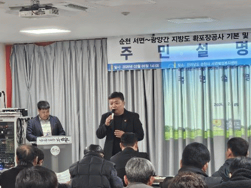Á¤¿µ±Õ ÀÇ¿øÀº 5ÀÏ, ¼øÃµ½Ã ¼¸éÇàÁ¤º¹Áö¼¾ÅÍ È¸Àǽǿ¡¼ ¿¸° ¡®Áö¹æµµ 840È£¼±(¼¸é~±¤¾ç °£) È®Æ÷Àå°ø»ç ±âº» ¹× ½Ç½Ã¼³°è¿ë¿ª Áֹμ³¸íȸ¡¯¿¡ Âü¼®ÇØ »ç¾÷ ÇöȲÀ» Á¡°ËÇϰí Áö¿ª¹ÎÀÇ ÀǰßÀ» ûÃëÇß´Ù.