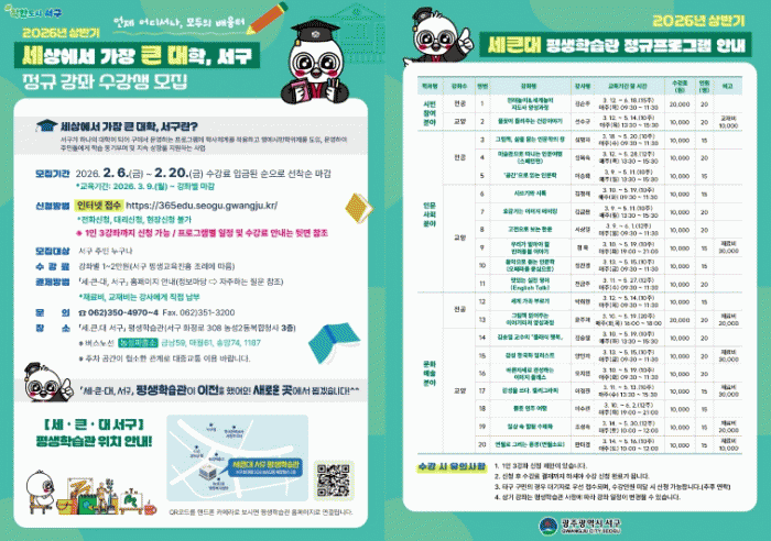 À̹ø °Á´ ½Ã¹ÎÂü¿©¡¤Àι®»çȸ¡¤¹®È¿¹¼ú µî 3°³ Çаú, 20°³ °Á·Π±¸¼ºÇß´Ù. ½Ã¹ÎÂü¿©Çаú¿¡¼´Â ³îÀÌÁöµµ»ç ¾ç¼º µî 2°³ °úÁ¤À» ¿î¿µÇϰí Àι®»çȸÇаú¿¡¼´Â Àι®ÇС¤Çѹ®¡¤¿µ¾î ºÐ¾ß µî 9°³ °úÁ¤À» ¸¶·ÃÇß´Ù. ¹®È¿¹¼úÇаú¿¡´Â ¼¼°è °¡°î ºÎ¸£±â, ͏®±×¶óÇÇ, ÇÃ·çÆ® ¿¬ÁÖ µî 9°³ °úÁ¤ÀÌ Æ÷ÇԵƴÙ. °Áº° ±³À° ³»¿ë°ú ¿î¿µ ±â°£ µî ÀÚ¼¼ÇÑ »çÇ×Àº ¼¼Å«´ë ´©¸®Áý °øÁö»çÇ׿¡¼ È®ÀÎÇÒ ¼ö ÀÖ´Ù.