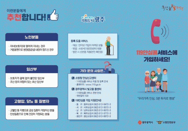 ¡®119¾È½ÉÄÝ¡¯ ¼ºñ½º´Â ´©¸®Áý(u119.nfa.go.kr)¿¡¼ °£ÆíÇÏ°Ô °¡ÀÔÇÒ ¼ö ÀÖÀ¸¸ç, °¡±î¿î ¼Ò¹æ¼¸¦ ¹æ¹®ÇØ µî·ÏÇÒ ¼öµµ ÀÖ´Ù. º»ÀλӸ¸ ¾Æ´Ï¶ó º¸È£ÀÚ°¡ ´ë¸® µî·ÏÇÒ ¼ö ÀÖ°í, ÇÑ ¹ø µî·ÏÇϸé Àü±¹ ¾îµð¼µç 119 ½Å°í ¶§ µî·Ï Á¤º¸°¡ ¿¬°èµÅ º¸´Ù Á¤È®ÇÏ°í ½Å¼ÓÇÑ ±¸±Þ ¼ºñ½º¸¦ ¹ÞÀ» ¼ö ÀÖ´Ù.