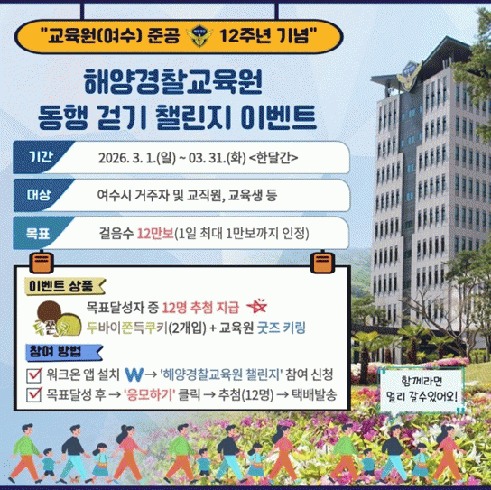 ¿©¼ö Áö¿ª °ÅÁÖÀÚ¿Í ±³À°¿ø ±³Á÷¿ø¡¤±³À°»ýÀ̶ó¸é ´©±¸³ª Âü¿© °¡´ÉÇϸç, GPSÀÎÁõÀ» ÅëÇØ ¿©¼ö Áö¿ª ³» °ÉÀ½¼ö°¡ ÀÎÁ¤µÈ´Ù. Âü¿©ÀÚ´Â Çà»ç ±â°£ µ¿¾È 12¸¸º¸(1ÀÏ ÃÖ´ë 1¸¸º¸)¸¦ ´Þ¼ºÇÏ¿© ÀÀ¸ðÇÒ ¼ö ÀÖ´Ù. ¸ñÇ¥ ´Þ¼ºÀÚ Áß ÃÑ 12¸íÀ» ¼±¹ßÇØ ±â³äǰÀ» ÁõÁ¤Çϸç, Èñ¸ÁÀÚ¿¡ ÇÑÇØ ±³À°¿ø ¹æ¹® °ßÇÐ ±âȸµµ Á¦°øÇÑ´Ù.